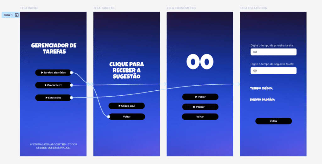Aprender a usar o Figma é um passo fundamental para quem deseja criar aplicações, porque permite planejar e visualizar as telas antes de começar a programar. Ao desenvolver este protótipo do Gerenciador de Tarefas, você organizou a estrutura do app, definiu as funcionalidades principais (tarefas aleatórias, cronômetro e estatística) e montou um fluxo de navegação claro entre as telas. Com isso, fica muito mais fácil transformar a ideia em código depois, já que o protótipo funciona como um guia visual do que o programa precisa fazer e de como o usuário vai interagir com ele.